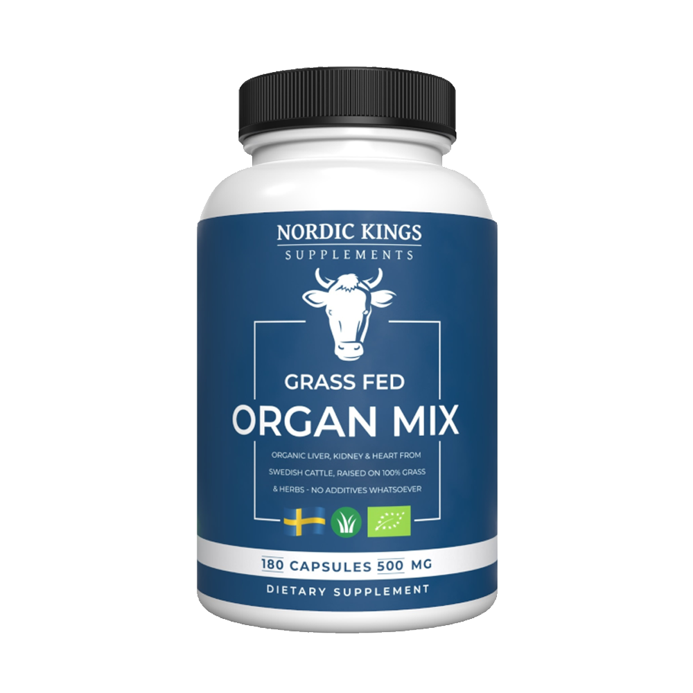 Ingredientes: 33,3% Rim + 33,3% Fígado + 33,3% Coração de bovino sueco , alimentados a 100% pastoreio, com certificação BIO e KRAV, em cápsula vegetal.