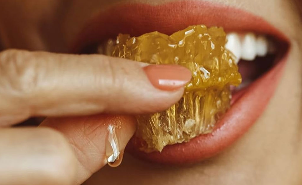 Mastigar diretamente — corta um pedaço do favo e mastiga como goma natural, libertando o mel e absorvendo o sabor puro da colmeia.