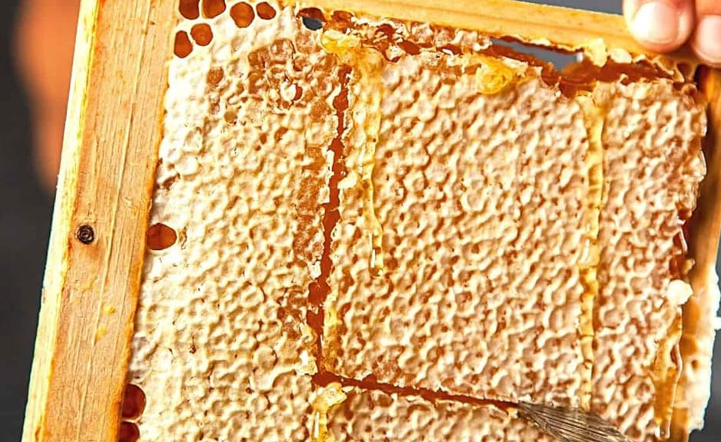 A forma mais pura e ancestral de consumir mel: direto da colmeia, ainda selado no favo e no próprio quadro de madeira.