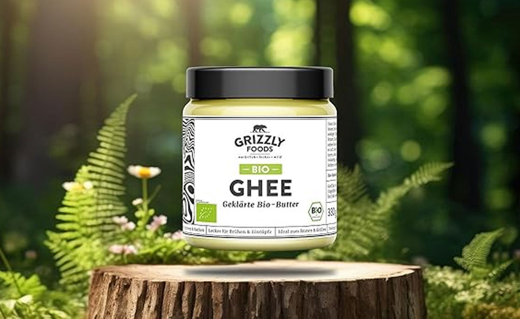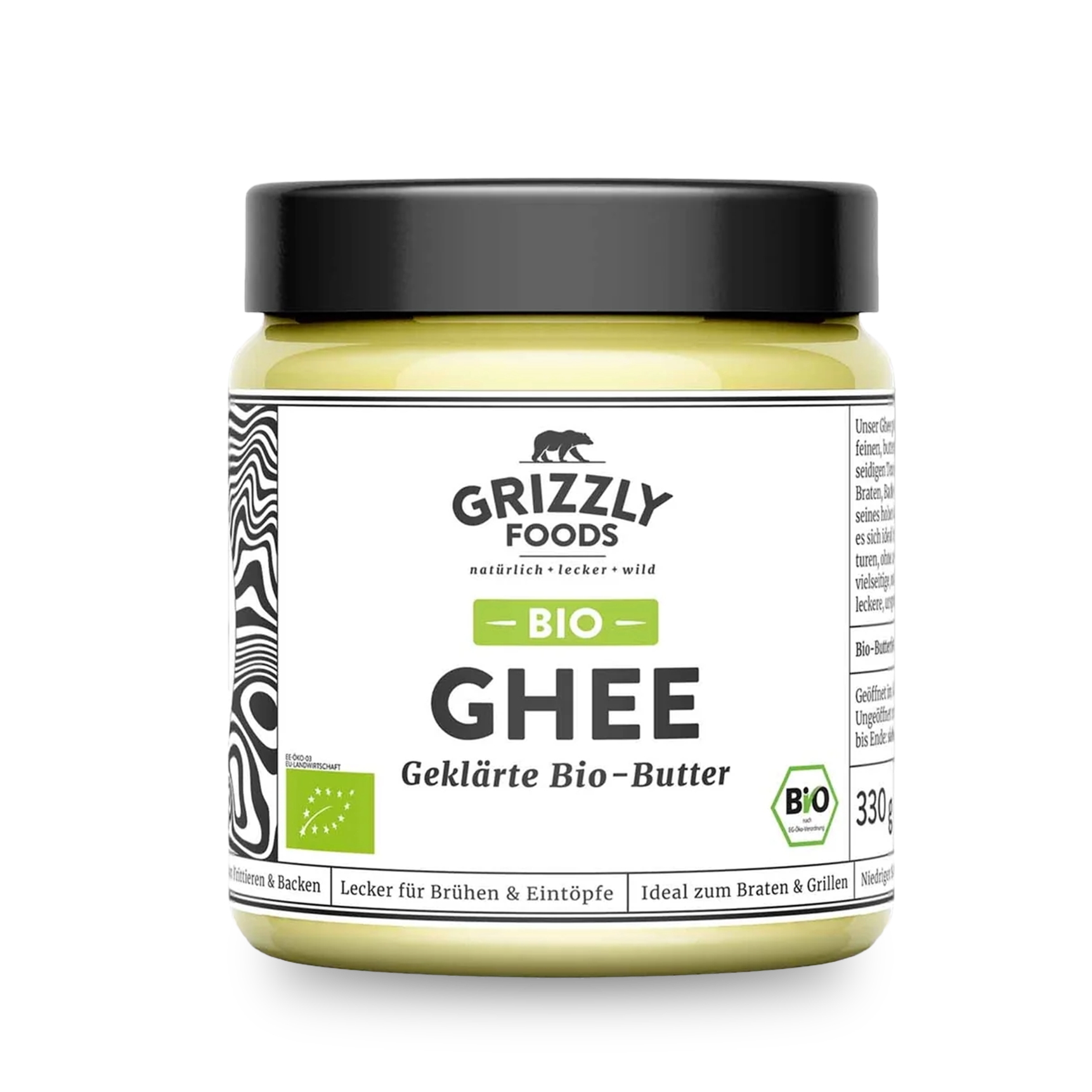 Frasco de vidro com 330 g de Ghee biológico (Grizzly Foods – Alemanha).
