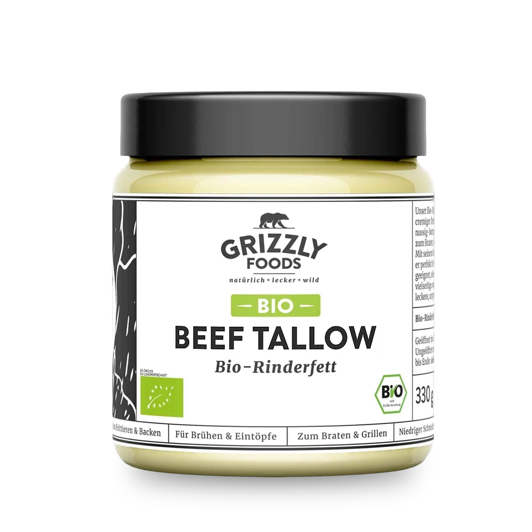 Frasco de vidro com 330 g de sebo bovino biológico (Grizzly Foods – Alemanha).
