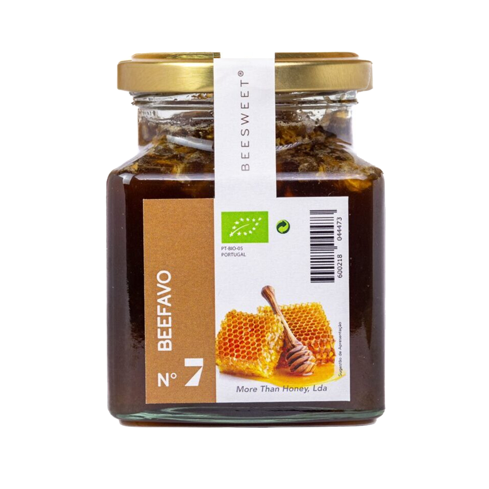 Ingredientes: Mel multifloral cru biológico — não aquecido, não filtrado, sem aditivos; pedaço de favo natural inalterado (cera de abelha + pólen residual)